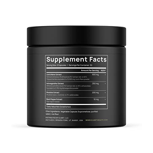 ELMNT 20,000mg 16x Strength Lions Mane Super Nootropic + Adaptogens Brain Supplement - Highest Potency Lion's Mane Extract 50% Polysaccharides w. Ashwagandha & Rhodiola for Focus, Energy, Memory