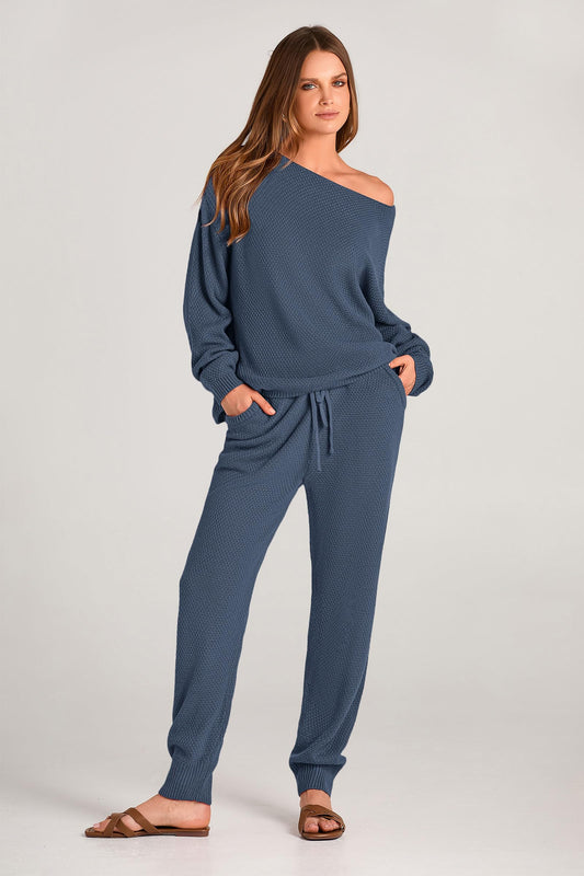 PRETTYGARDEN Womens 2 Piece Outfits Fall Trendy Knitted Pullover Sweater And Long Pants Matching Jogger Sets (Blue,Large)